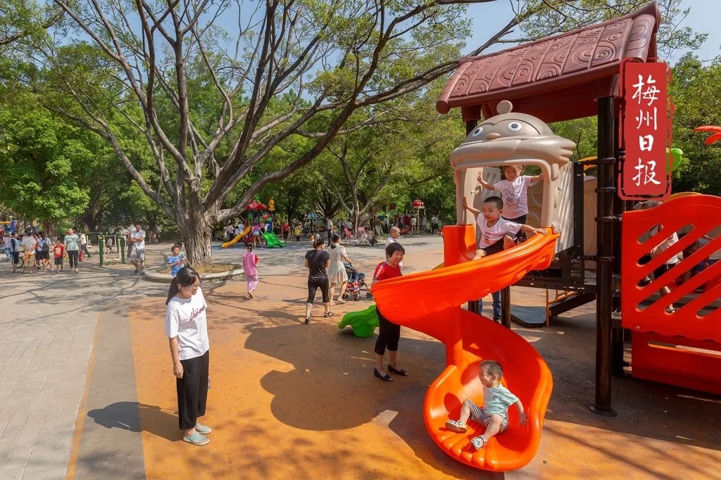 “推窗見綠,出門見園”,孩子們在公園里嬉笑玩耍。(連志城 攝)