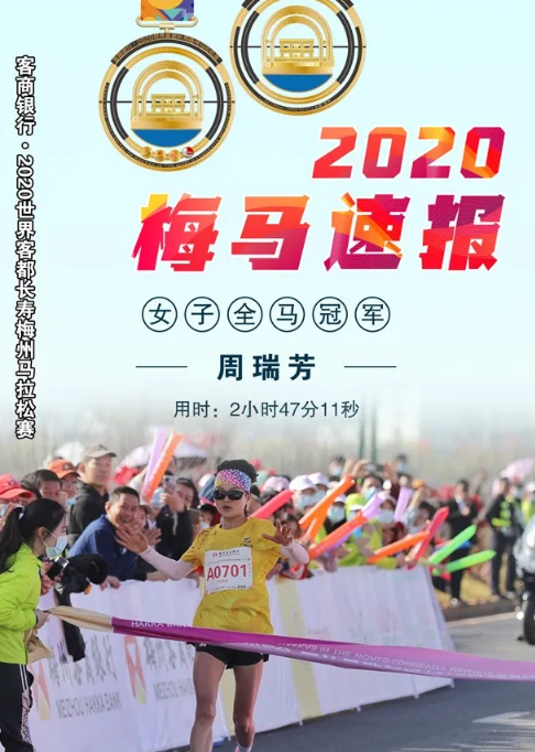 女子全馬冠軍是來自上海的周瑞芳,她在接受采訪時表示:“我特地從上海過來參加梅馬,梅州給我的印象特別好,空氣清新、山清水秀,謝謝梅州,希望梅馬越辦越好!”