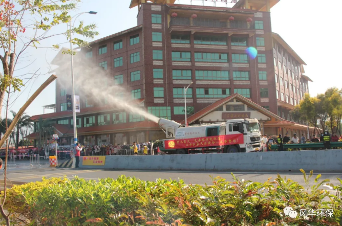 風華霧炮與其他設備相比更有利于節約水資源,高效完成降溫、除塵等任務。以前工地常用高壓水槍來除塵,10噸的灑水車只能噴10分鐘左右。而風華霧炮車同樣10噸水可噴灑2個小時,覆蓋面積超過3萬平方米,“霧炮”的降溫、洗塵效果相當明顯。