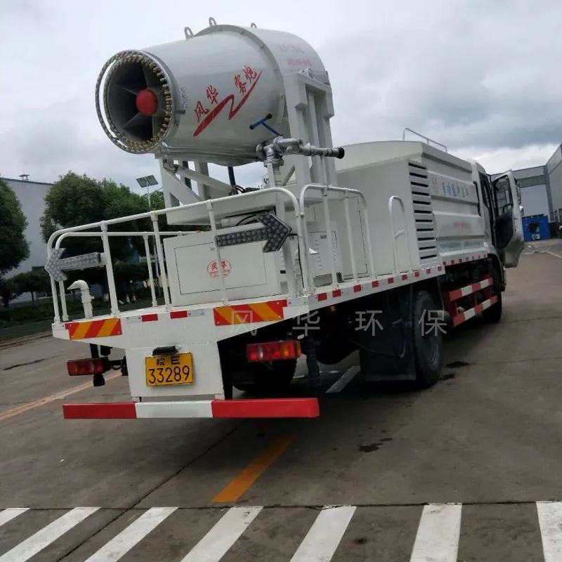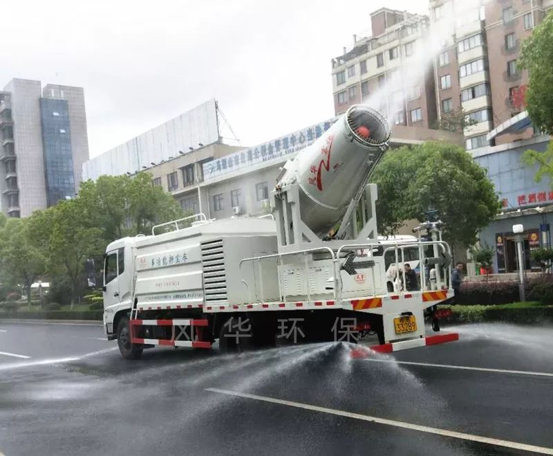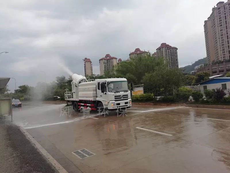 “霧炮車”可蓄水8噸,通過遠距離噴霧系統能噴射100米遠、50米高的水霧,有強大的噴霧降塵作用。