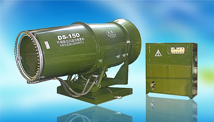 將水溶液慢慢地霧化成為粉塵一般的霧氣,再通過風機裝置將霧氣噴射到更遠的地方,可以有效抑制揚塵,凈化空氣。霧炮機是根據風送原理,先使用高壓泵、微細霧化噴嘴將水化,再利用風機風量和風壓將霧化后的水霧送到較遠距離,使得水霧到達較遠距離同時能夠覆蓋更大面積,水霧與粉塵凝結后降落,從而達到降塵目的。